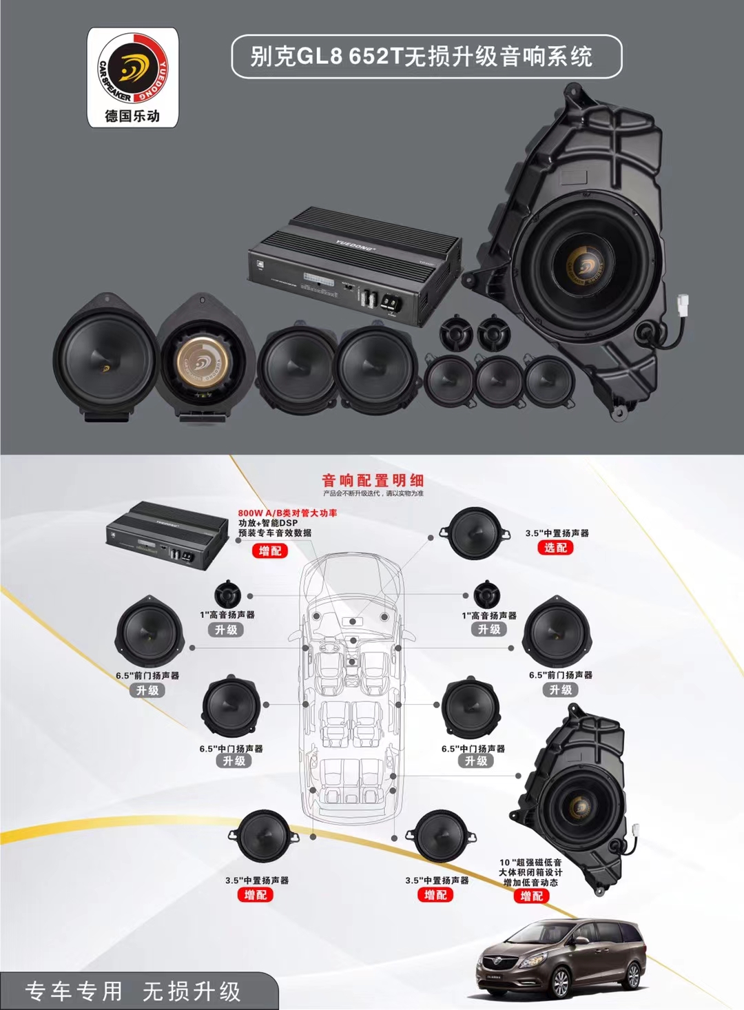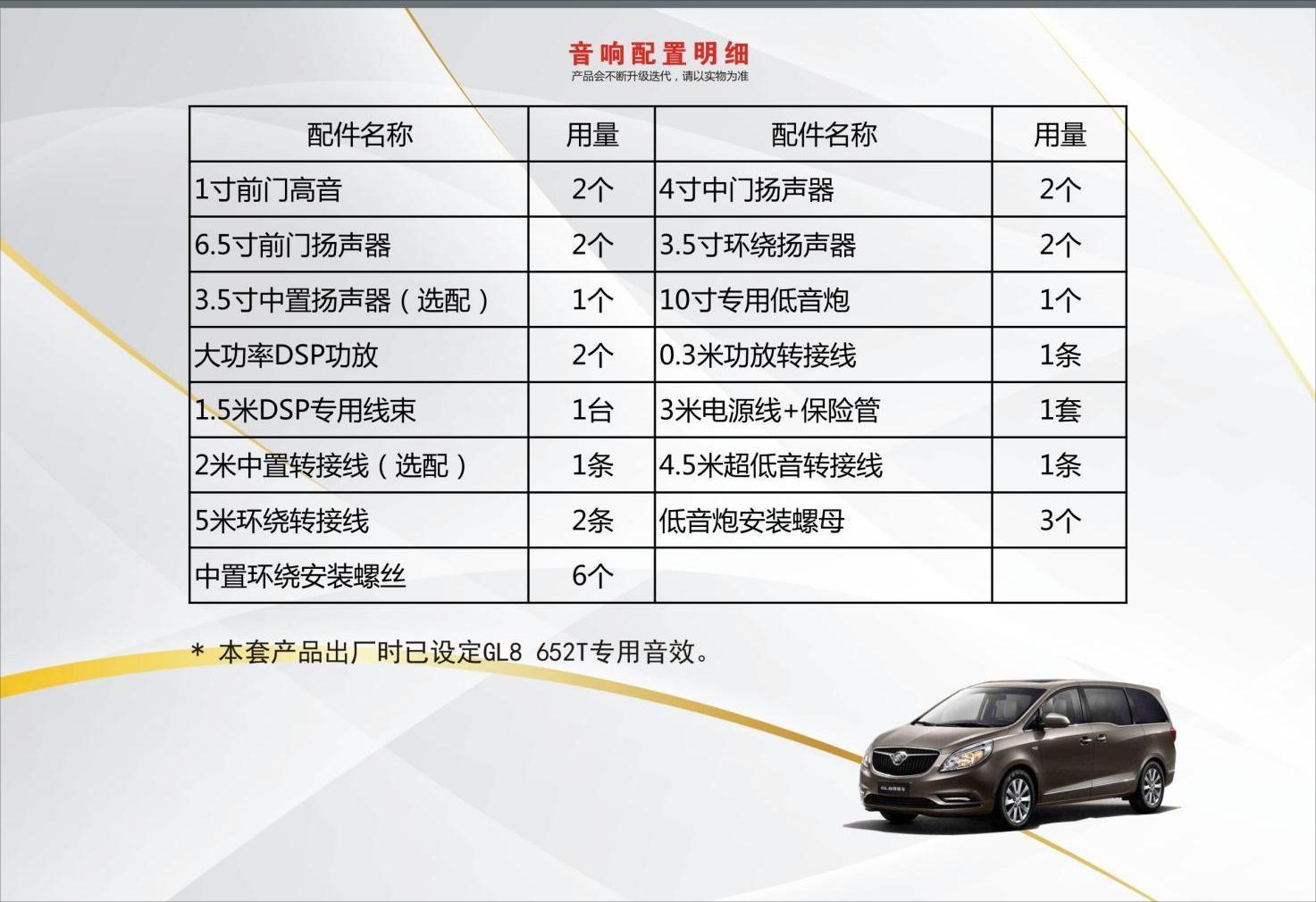 別克GL8ES、GL8653T專車專用音響,無損對接,原位安裝,大功率AB類功放,10寸超重低音,完美提升原車音響效果。